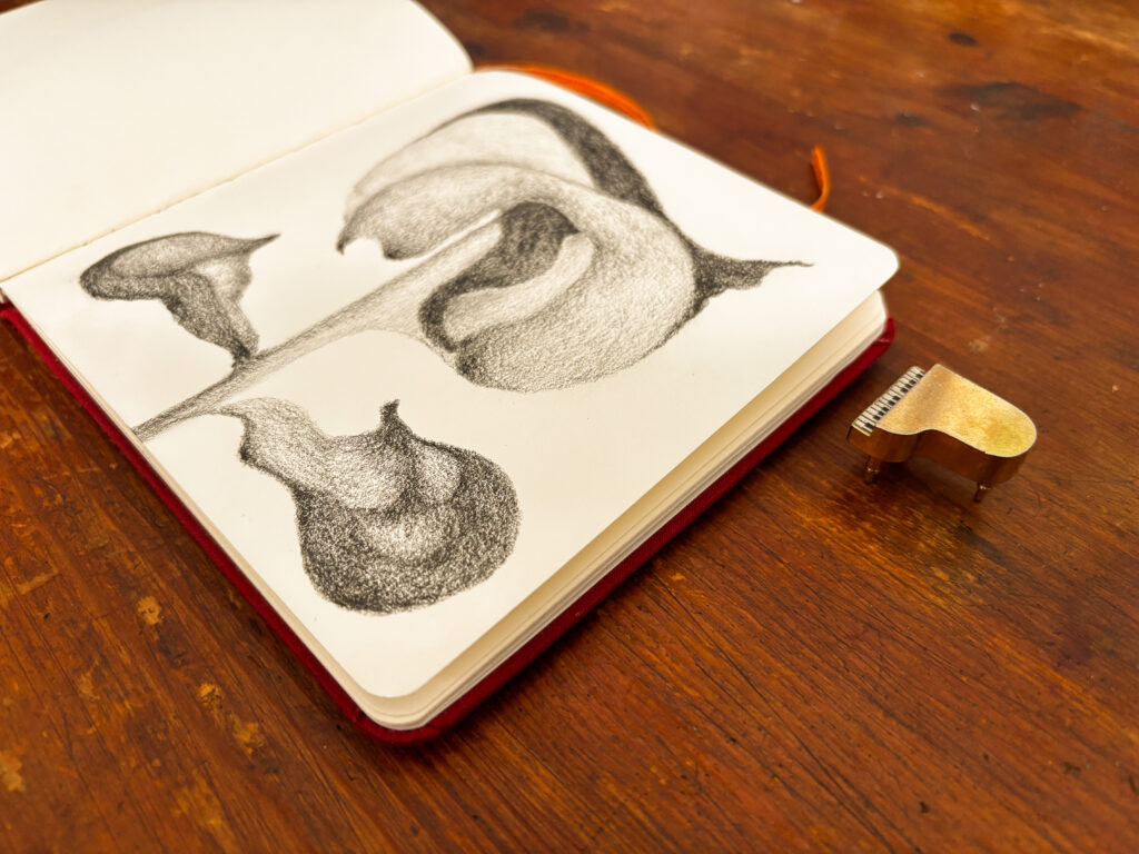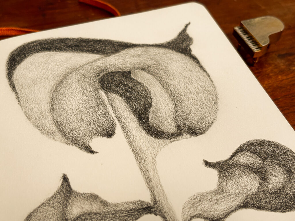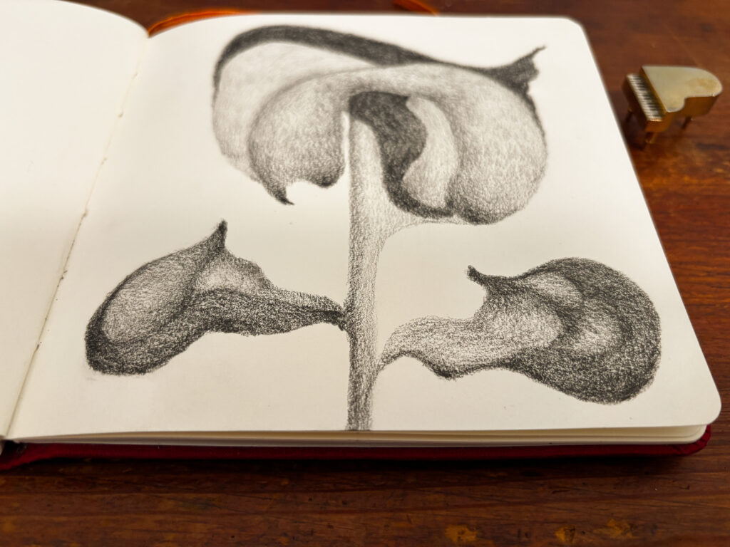 I wanted to draw a flower that looked like it had some weight and heft to it. What I wound up drawing had large curvy sections and distinct darker sections. Even its leaves look substantial. Of course, there is nothing in the drawing to denote scale, but this was part of the challenge.