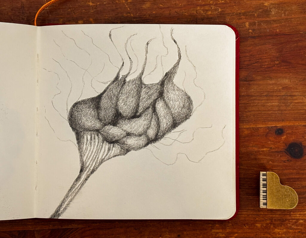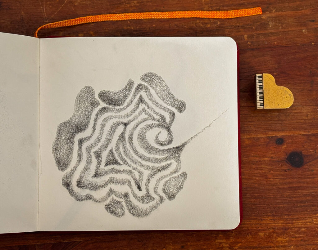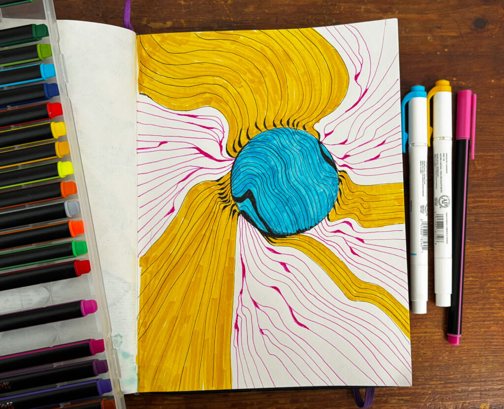 The piece below was more of a sunscape doodle. I thought of the hottest blue tone of a fire’s flame and the yellows growing out of it. In any case, I have always loved drawing curvy, flowing lines. I probably always will.