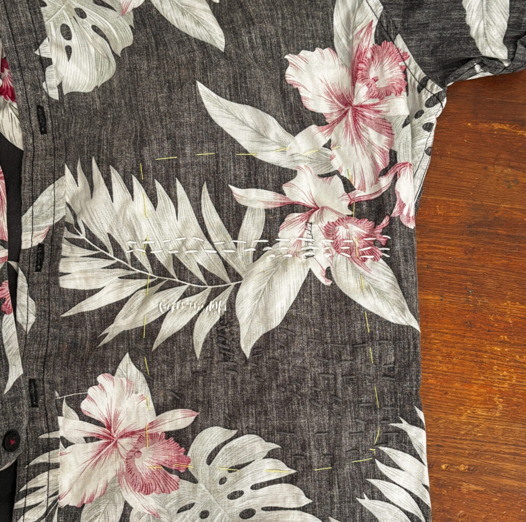 With a friend’s help, I am learning how to mend damaged fabric. This Hawaiian shirt of mine managed to get torn in three places. I am trying out a Japanese mending practice called sashiko on the damaged parts. My goal is to make the mend look like art. This is a work in progress that I may redo a couple of times over.