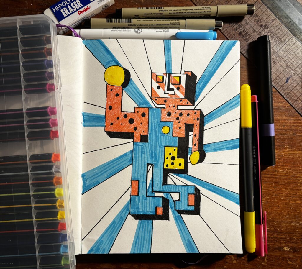 I wanted to draw a robot, and I enjoyed it so much that I will draw more! This modern creature pictured below is half robot and half robot dog. Yeah, it is kind of weird, but I am happy with it. (They separate and chase each other around, obvs.)