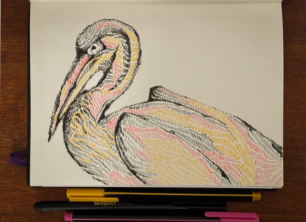 I decided to stick with warmer tones for this drawing, which is a departure from how I generally like to mix cool and warm tones together. Marrying pink and yellow for this bird felt like a good direction.